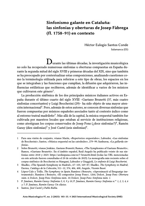 The composition of symphonies in Spain received a notable impetus during the second half of the eighteenth century through the genre’s two most renowned representatives of the period, Gaetano Brunetti and Luigi Boccherini. In the Catalan sphere, the most prolific creator of symphonies at this time was Carles Baguer, who served as organist of Barcelona Cathedral from 1790 until his death. However, the symphonic production of Josep Fàbrega, a violinist active in Barcelona between 1758 and 1791, is a pioneering contribution that thus far has hardly been explored. This article introduces Fàbrega biographically and historiographically, then details the known sources of his twelve symphonies and overtures, arranging them according to their copyists and presenting evidence of their use. Finally, a preliminary analytical approach to these works is proposed that draws upon Mary Sue Morrow’s work on eighteenth-century symphonic repertoire as well as the Sonata Theory developed by James Hepokoski and Warren Darcy. The present study expands current knowledge of the Spanish symphonic repertoire of this period, situates these twelve unpublished compositions stylistically, and documents their reception.