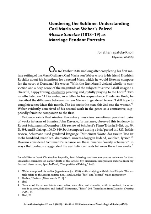 Carl Maria von Weber composed two settings of the Mass for the Dresden court in quick succession. The first of these Masses celebrated the name day of his patron, King Friedrich August I, while the second honored Queen Amalia Augusta and also commemorated the royal couple’s fiftieth wedding anniversary. As he was completing the second Mass, Weber wrote: “The first one is the man, this second one the woman.” The present article argues that the two works musically exemplify the type of relationship that had long been embodied in marriage pendant portraits. In theorizing how a pair of musical compositions may convey idealized masculine and feminine virtues in a similar manner to marriage pendant portraits, my analysis draws upon ideas of the sublime and the beautiful. These complementary aesthetic concepts were regularly employed in the era’s music criticism and discussed in gendered terms. Together, Weber’s Masses form an expressive doubling, a type of aesthetic pairing that Lawrence Kramer characterizes as “a form of repetition in which alternative versions of the same pattern define a cardinal difference in perspective.” Each Mass individually manifests conventional gender traits. Considering them together, however, enriches our understanding of these works by revealing how they illustrate idealized gender roles within marriage.
